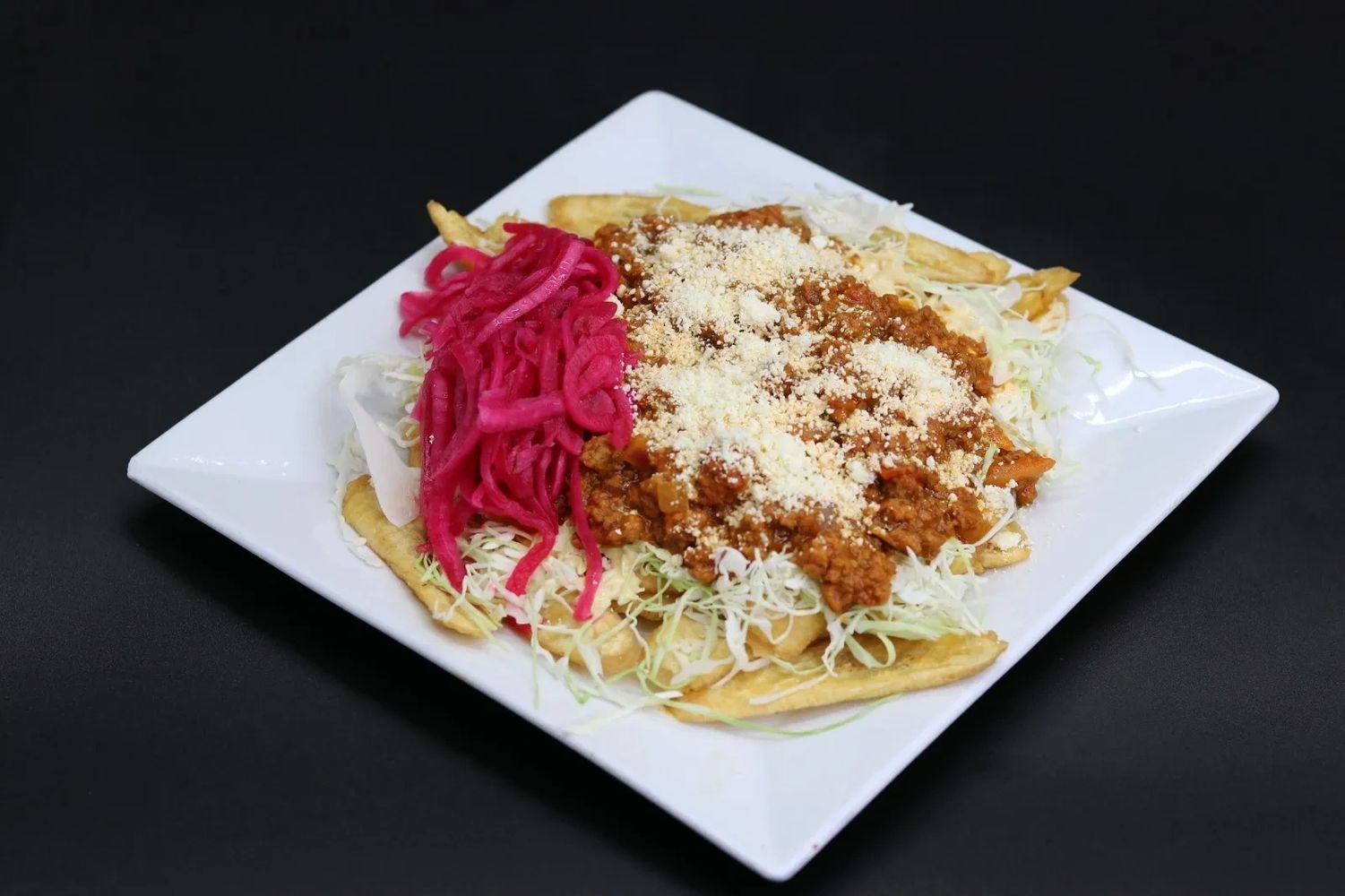delicious fried plantain loaded with ground beef cabagge salad pico de gallo sauce and cheese